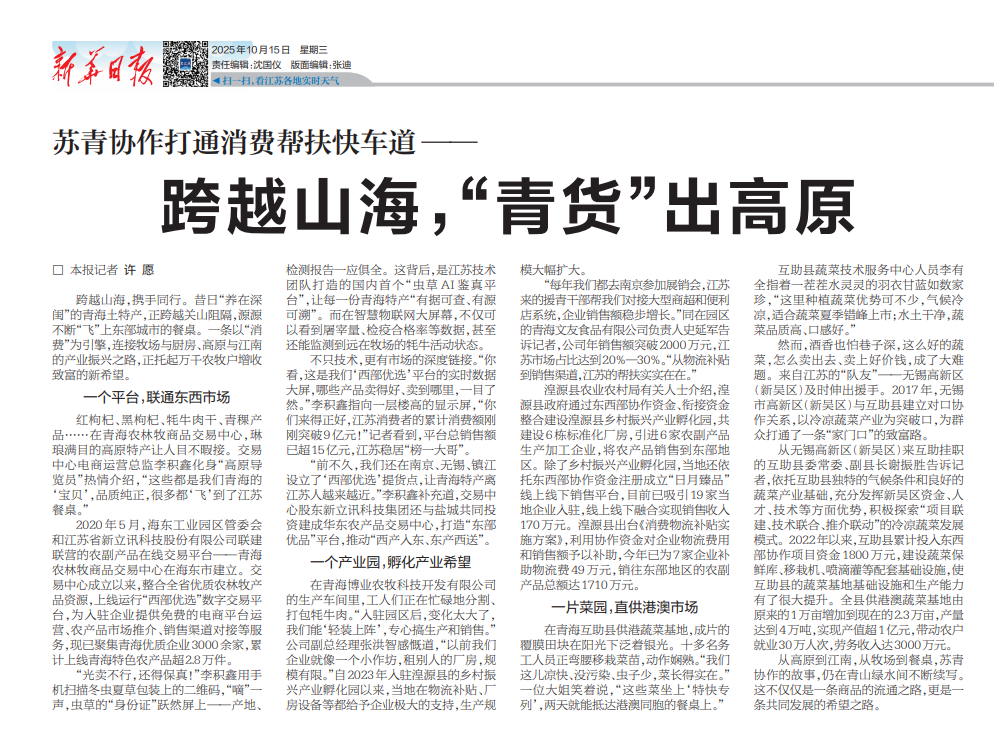 “前不久,我們還在南京、無錫、鎮江設立了‘西部優選’提貨點,讓青海特產離江蘇人越來越近?!崩罘e鑫補充道,交易中心股東新立訊科技集團還與鹽城共同投資建成華東農產品交易中心,打造“東部優品”平臺,推動“西產入東、東產西送”。