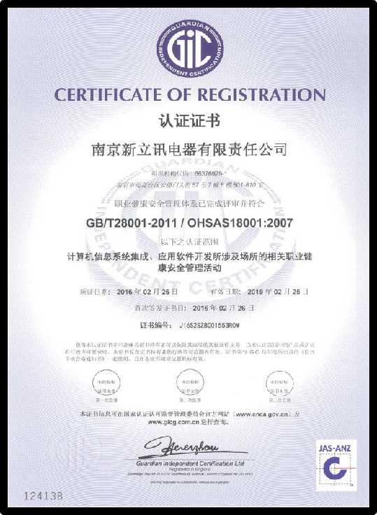 2016年2月28日,經(jīng)過嚴(yán)格有序的認(rèn)證審核,審核組專家就南京新立訊電器有限責(zé)任公司體系運(yùn)行現(xiàn)狀的具體情況進(jìn)行總結(jié),并給予了客觀的評(píng)價(jià)。專家組表示,新立訊 ISO三大管理體系運(yùn)行狀況良好,符合體系認(rèn)證的要求。經(jīng)過專家組的認(rèn)定和審核,南京新立訊電器有限責(zé)任公司順利通過了ISO9001質(zhì)量管理體系、ISO14001環(huán)境管理體系、OHSAS18001職業(yè)健康安全管理體系認(rèn)證,獲得了相關(guān)證書。此次三大管理體系的認(rèn)證,標(biāo)志著新立訊企業(yè)質(zhì)量管理水平和管理理念的不斷提升,為企業(yè)向社會(huì)提供優(yōu)質(zhì)的產(chǎn)品和服務(wù)提供了強(qiáng)有力的保障。