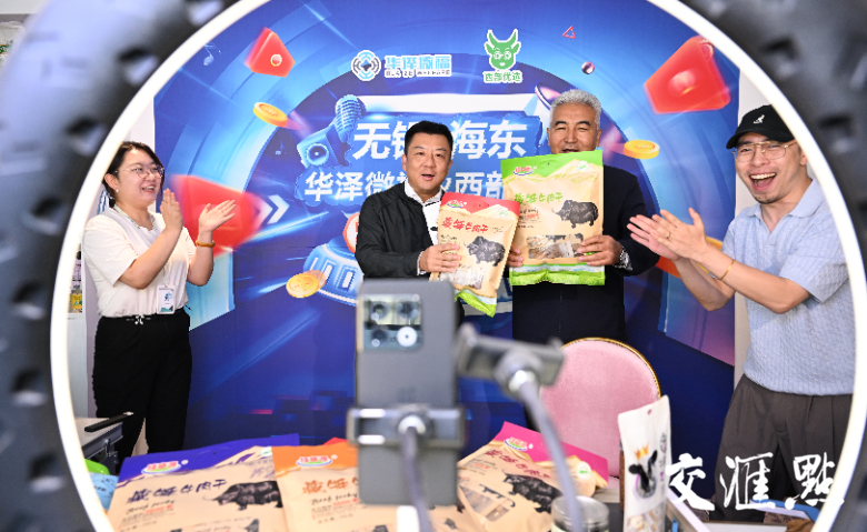 交易中心一樓大廳,分布著4個電商直播間,一端連著消費者,一端連著供應商。在一號直播間,無錫—海東“聯農帶農”農副產品直播正在進行??吹街鞑ベu力吆喝、氣氛熱烈,省委書記信長星提議:無錫市和海東市的書記,你們也帶帶貨!這一提議得到了兩省領導和代表團成員的一致贊同。